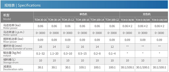 The TCM series metering masterbatch mixer is suitable for automatic proportional mixing of new materials, secondary materials, master?batch or additives, etc. This series of models uses a DC brushless motor, which is mixed according to a pre-selected proportion. The conditions set by the touch screen microcomputer control system are automatically converted into rotational speed to directly drive the precision screw extrusion of raw materials, with an error value not exceeding ± 1%. The motor reduction ratio of this product is divided into two types: 30:1 and 100:1, and the screw diameter is divided into three types: 12, 14, and 16mm. It can evolve into six models and provide different output quantities of 0.1-32kg/h for customers to choose from. There is also a dual color master machine, which can be combined with any two color master machines according to customer needs.