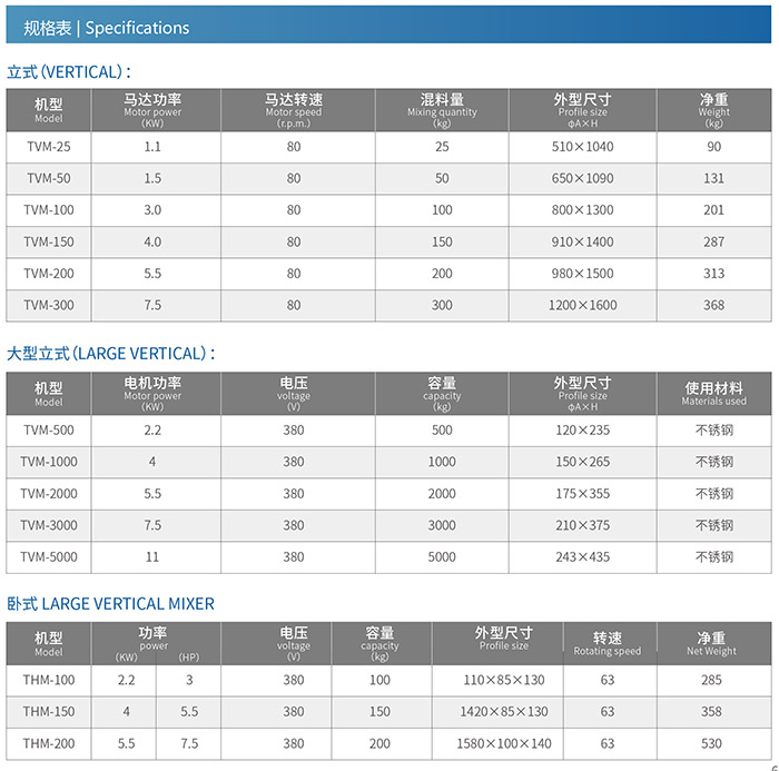 TVM series vertical mixer for powder, granular material mixer, has the characteristics of simple structure, easy operation, easy mainte?nance and cleaning, fast speed, good mixing effect. Mainly used for plastic mix, can also be widely used: plastic, powder, metallurgy,