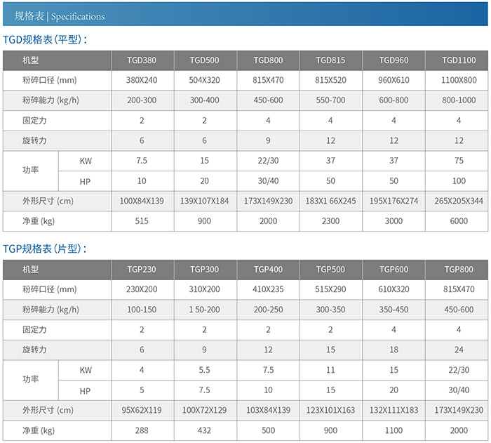 TG-D-P 系列粉碎机,分为爪型破碎机系列,平型破碎机系列,片型破碎机系列。以上机型适用面广,供各类塑料制品,粉碎回收