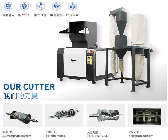 刀架优化设计,爪型刀可分散受力度,使得每片刀的剪切加大,适合破碎厚材料,硬质料块,料头等,有效的提高了刀具切削力、减少刀具磨损设有电控安全设计,料斗采用双层结构,内填隔音材料,使得设备具有良好的安全性及环保性,省电耐用。