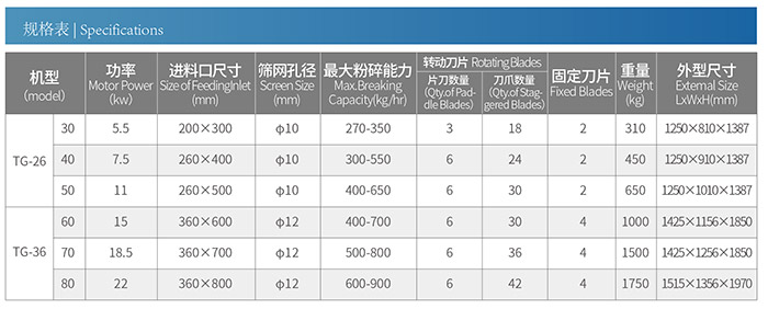TG-26/36 series is suitble for granulating a variety of plastic materials, including waste materials of injection molding, blowing molding